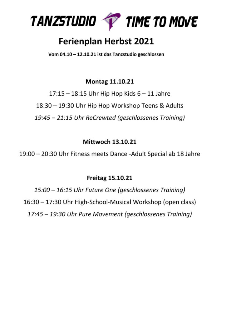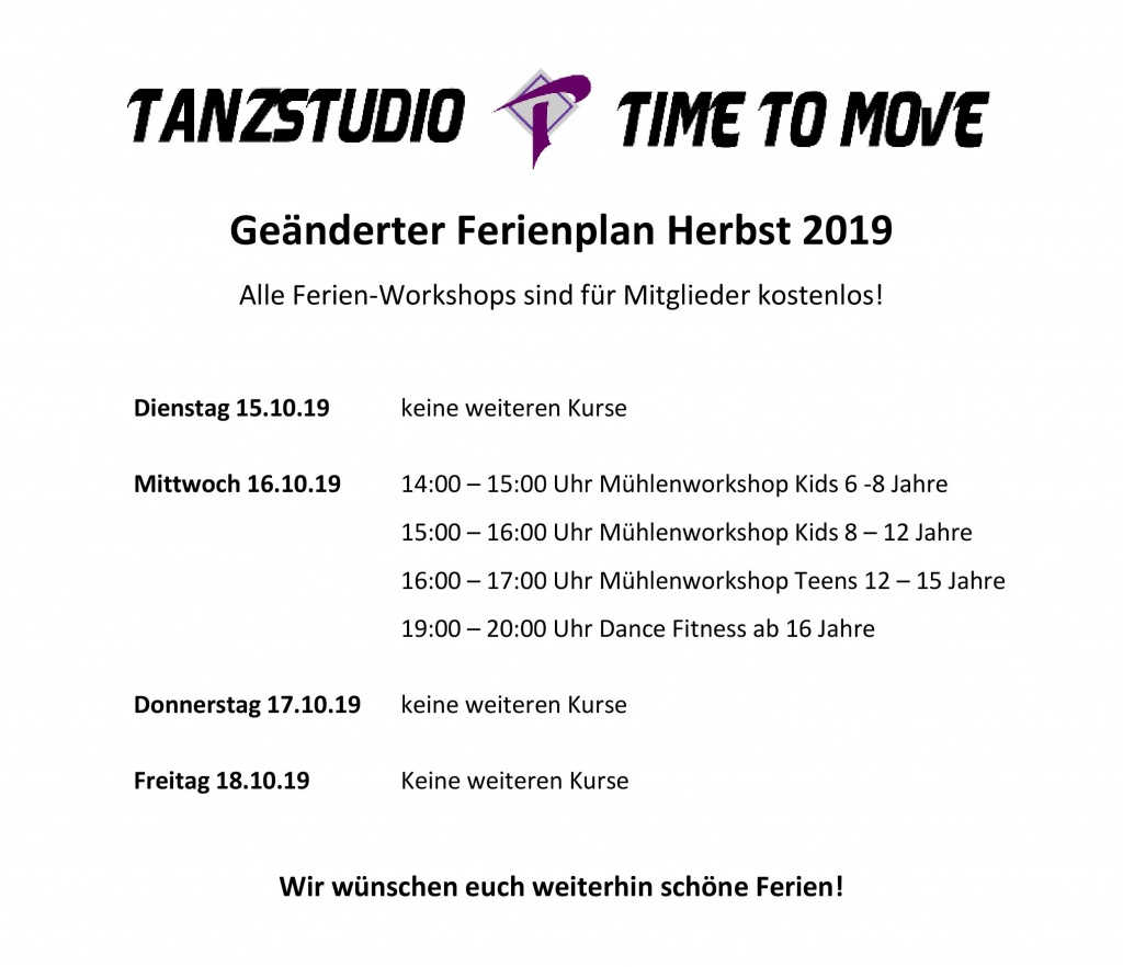 Das Tanzstudio Time To Move wird zum 31.12.2024 aufgrund von persönlichen Veränderungen geschlossen.